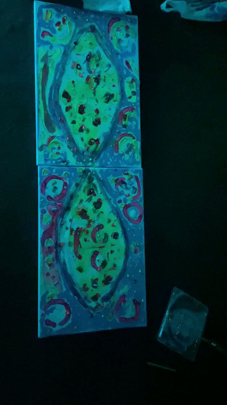 "3in 1" is a series of art works that combines coloured ink, glow in thé dark paintings and phosphorescent materials.
